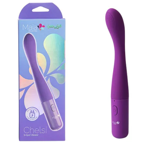 Chelsi features 10 vibration levels and measures 7 inches in length with an insertable length of 4.5 inches. Chelsi is recommended for use with Water-Based Lubricants or Hybrids and can be cleaned with mild soap or adult toy cleaner. Quick charge time with charging cable included.