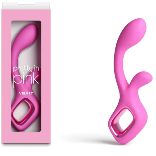 Velvet by Pretty in Pink – A sleek G-spot rabbit vibe with a contoured silhouette and firm, non-flexible design. Made from smooth silicone with ABS accents for a polished finish. Rechargeable. Waterproof. Suitable with all lubricants. 3 speeds / 6 functions.
