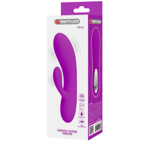 Pretty Love Alvin is a silicone rabbit massager with 17.5cm total length, dual-stimulation shaft, and 7 vibration modes for intense G-spot and clitoral pleasure.