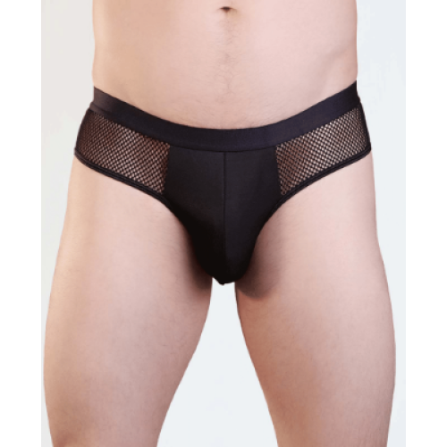 Mens jock-strap underwear with mesh side panels and solid pouch.