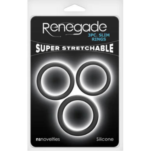 Renegade’s 3 piece Slim Rings are super stretchy, silicone rings available in three sizes to provide endless combinations of restrictive enjoyment. Suitable with all lubricants.