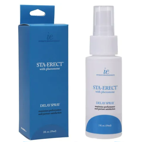 Sta-Erect Spray Box. Just one spray makes your pleasure last a lot longer! These odourless and tasteless products allow you to delay ejaculation and orgasm until you are ready to let it go. Apply to decrease sensitivity and extend your lovemaking. It’s fast, effective and greaseless too, so it won’t stain your sheets or her sexy lingerie.Contains 7.5% benzocaine which acts as a desensitizing agent to help the man maintain and prolong his erection and help delay or prevent premature ejaculation. Odourless and tasteless. This product can also be more helpful when used along with a cock ring. .5oz .Lotions/Potions & Aphrodisiacs from Doc Johnson Novelties
