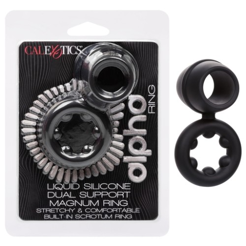 From bashful beginners to erotic experts, the Alpha? Liquid Silicone Dual Magnum Ring will wrap you up tight in pleasure with the ultra-plush, ultra-stretchy enhancer ring. The playful ring is made from an ultra-stretchy liquid silicone with a daring dual ring design. This stretchy, comfortable cock ring is made to increase stamina, improve sensitivity, and deliver superior erection support. The durable scrotum support ring lets you indulge even further into increased stamina. Look for an explosive pleasure experience while the plush ring squeezes with every movement. The premium liquid silicone is soft, smooth, durable, and waterproof.