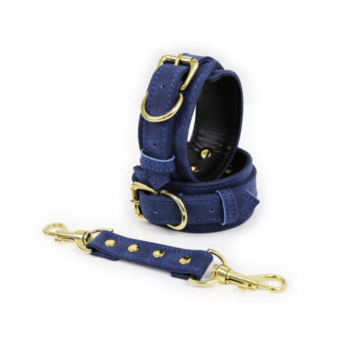 Soft, padded wrist restraints with gold coloured hardware, available in flat black leather and blue sueded leather . Made from vegan friendly leather.